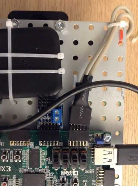 En este punto usted probablemente los avisos de que los cables del Pmod son peligrosamente sueltos. Se puede arreglar con unas ataduras de cremallera. Amarra los cables hacia abajo manteniendo la mayor parte en el cable lo más atrás en el Zybot como sea posible.