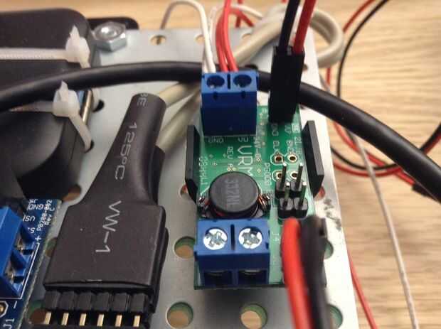 Otra vez esto va a ser diferente según el regulador de tensión. El que estoy usando tiene un conjunto de pines de entrada. Así que tomo mi batido especial para cable MTE y conecte el lado de alimentación en el Vin y el lado de tierra en la tierra.