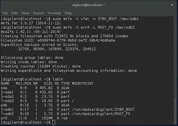 - Escriba sudo mkfs -t vfat -n ZYBO_BOOT/dev/sdb1 en el terminal, esto Formatear partición 1 y título ZYBO_BOOT