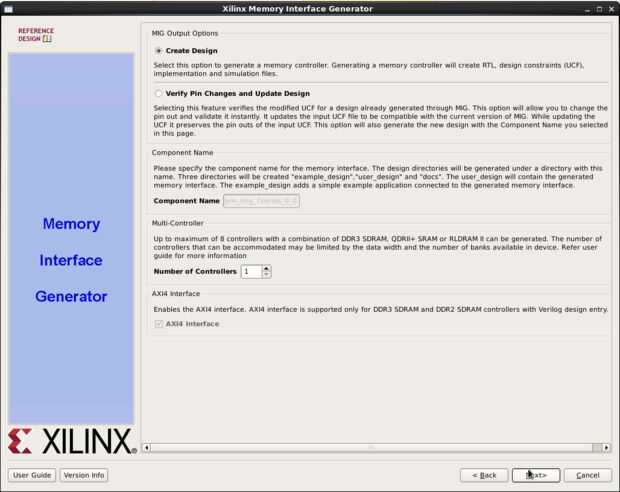 Paso 2: Por defecto, el integrador IP permite la opción de crear diseño y establece el número de controladores en 1. Asegurar que el AXI4 interfaz casilla y haga clic en siguiente.