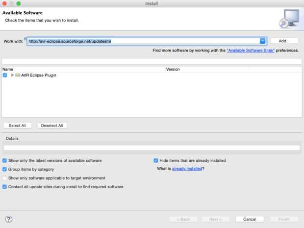 Junto a hacer es instalar el plugin de Eclipse AVR. Usted puede encontrar toda la información sobre el proceso de descarga en http://avr-eclipse.sourceforge.net/wiki/index.php/Plugin_Download