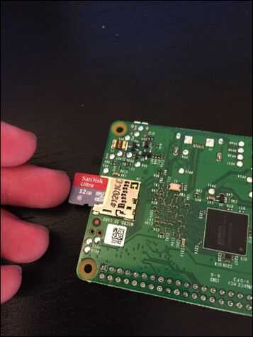 Inserte la tarjeta microSD en la parte inferior de la Pi en la ranura para tarjeta SD.