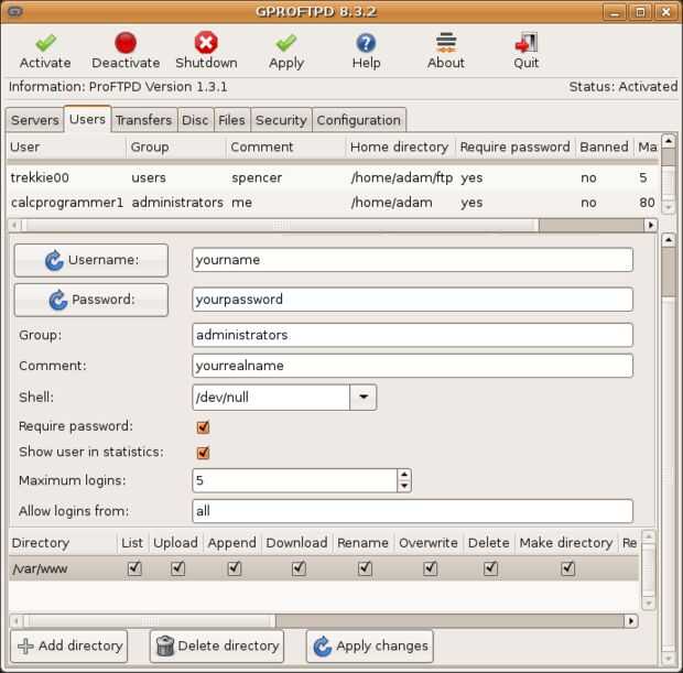 Para la parte inferior, ponga el directorio home del usuario. Para los míos, puse /home/adam/ftp. Ya que quise acceder a mi casa directorio de mi cuenta (/ home/Adán), le puse cuenta de todos los demás en un subdirectorio de mi home (/ home/Adán/ftp). De esa manera el directorio FTP es dentro de casa de mi cuenta de usuario, y mi cuenta FTP puede tener acceso a la FTP casero así como mi directorio personal. Te recomiendo que uses/home / / en tu directorio home, con todos los permisos comprobados y/home / / ftp para tus amigos (verificar permisos como mejor parezca). Permisos son autoexplicativos, para permitir que un usuario realice una determinada acción en un archivo o carpeta, active la casilla de verificación.