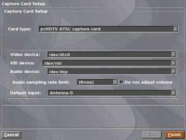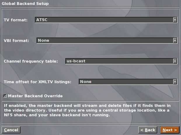 Ahora quiere iniciar la opción de back-end para que puedas config la configuración. La mayoría de los ajustes se puede dejar como está, pero quiere decir Mythtv que tipo de tarjeta de captura usas (marca de fábrica, detección de canales de humedal para la observación y etc, lo que es la fuente de vídeo, donde desea obtener sus listados de tv y etc.. MythTV es generalmente bastante buena sobre cómo detectar la tarjeta si es un nombre de marca, pero no siempre selecciona la opción de atsc. Simplemente ajuste el tipo de tarjeta para hacerlo.
