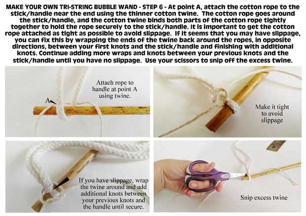 - En el punto A, coloque la cuerda de algodón en el palo de mango cerca del final con la más fina cuerda de algodón. Va la cuerda de algodón alrededor de la manija del palillo, y la guita del algodón une ambas partes de la cuerda de algodón muy juntos para sujetar la cuerda firmemente a la manija de palanca. Es importante que la cuerda de algodón atada tan firmemente como sea posible para evitar el deslizamiento. Si le parece que puede tener deslizamiento, puede solucionarlo envolviendo los extremos de la cuerda hacia atrás alrededor de las cuerdas, en direcciones opuestas, entre sus primeros nudos y el palo de mango y terminar con nudos adicionales. Seguir añadiendo más vueltas y nudos entre sus nudos anteriores y el palo de mango hasta que no hay deslizamiento. Use sus tijeras para cortar el hilo sobrante.