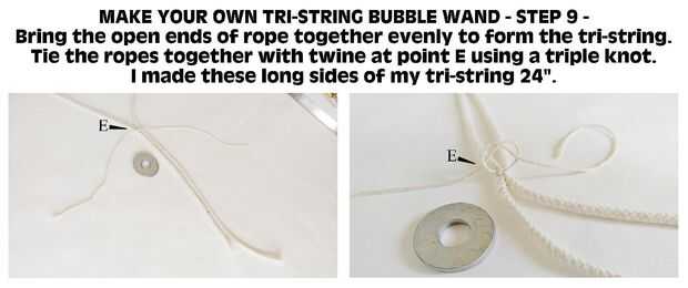 - Juntar los extremos abiertos de la cuerda uniformemente para formar la cadena de tri. Ate las cuerdas junto con cordeles en el punto E con un nudo triple. Hice estos laterales de mi tri-cadena 24".