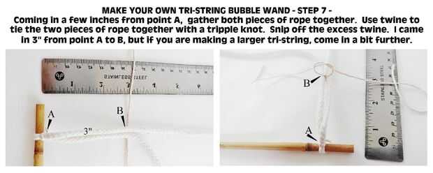 - Viene en unas pocas pulgadas del punto al punto B, se reúnen dos piezas de cuerda. Usar cordeles para amarrar los dos trozos de cuerda con un nudo triple en el punto B. Snip de la cuerda sobrante. Vino en 3" desde el punto al B, pero si usted está haciendo una grande cadena de tri, venir un poco más.