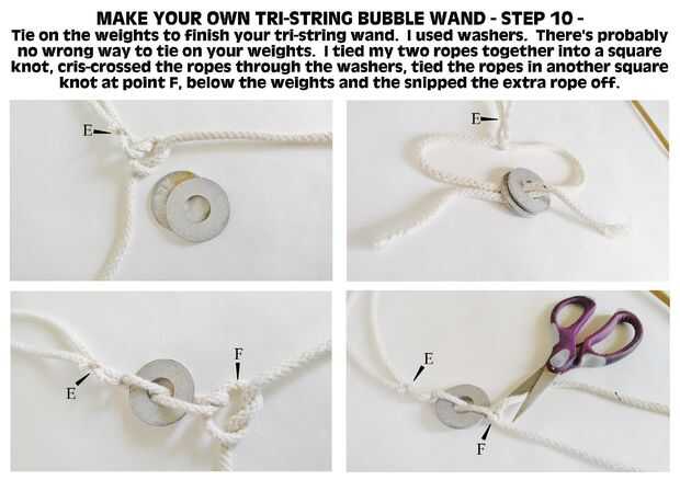 - Atar el peso al terminar su varita tri-cadena. Utilicé las arandelas. No hay probablemente ningún revés para atar su peso. Até mi dos cuerdas juntas en un nudo cuadrado, cris-cruzó las cuerdas a través de las arandelas atadas las cuerdas en otro nudo cuadrado en el punto F, por debajo de los pesos y el extra de la cuerda fuera cortada. Eso es todo! Ahora tienes una varita de bodacious tri-cadena!