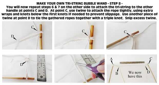 - Ahora repetimos los pasos 6 y 7 en el otro lado para sujetar la cadena tri a la otra manija en los puntos C y D. En el punto C, uso hilo para sujetar la cuerda firmemente al mango, con extra envuelve y nudos por debajo de los nudos anteriores si es necesario para evitar el deslizamiento. Utilizar otro pedazo de cuerda para atar las cuerdas se reunieron en el punto D con un nudo triple. Cortar el hilo sobrante.