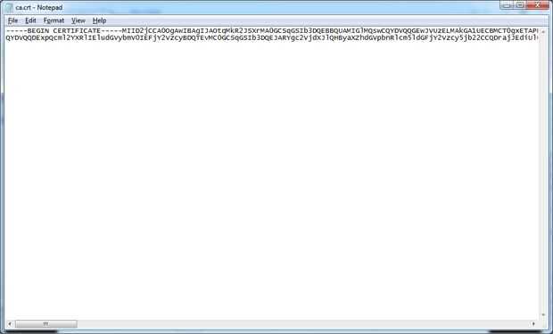 2. Abra Bloc de notas, luego arrastre el archivo ca.crt en el Bloc de notas, para abrir el certificado de acceso de Internet privada CA como un archivo de texto.