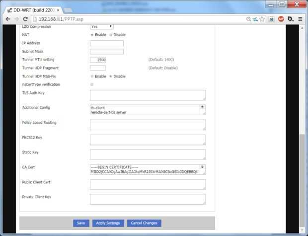 4. En el el DD-WRT página VPN, pegue todo el texto de certificado de CA en el campo de CA Cert . Asegúrese de que todo el texto es pegado, incluyendo "---Inicio certificado---" y "---fin---".