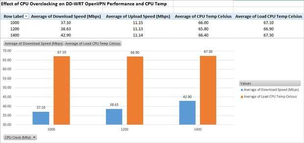 El mayor rendimiento de VPN medido en la prueba de 1400 MHz fue 44,17 Mbps; no es mucho menor que la velocidad no VPN de 50 Mbps. Como demuestran estas cifras, es posible alcanzar el overclock estable máximo de 1400 MHz con poco impacto a temps de CPU, incluso con la carga de una prueba de velocidad de Internet. Al parecer VPN throughput es CPU-bound, como el router cruje la criptografía matemática para la VPN, así que cada poco de ayuda de velocidad de CPU.
