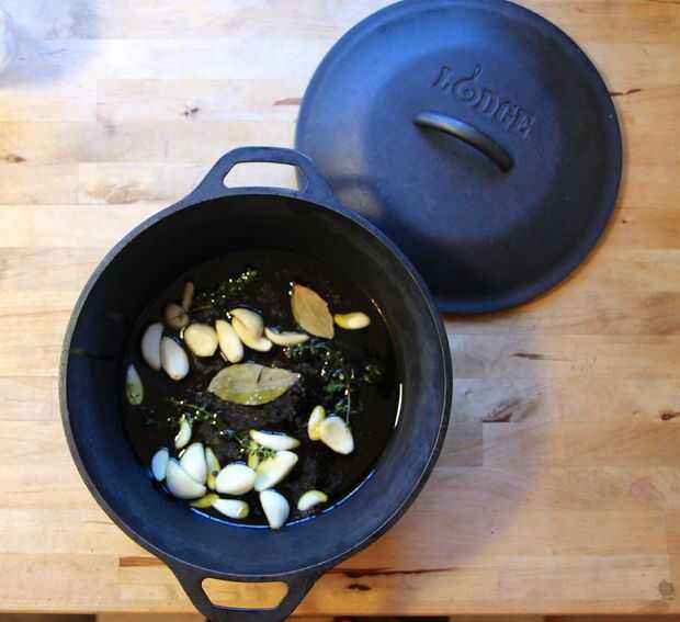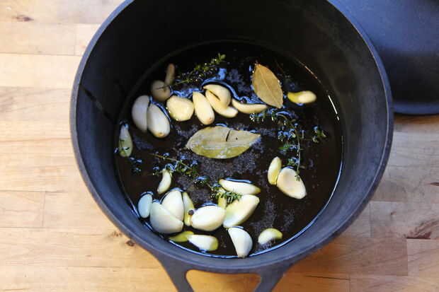 Coloque el ajo pelado, tomillo, hojas de laurel, pimienta en grano, sal y aceite de oliva en la olla. Coloque la tapa sobre la olla. Una vez hasta la temperatura de tu horno, coloque la olla en el horno.