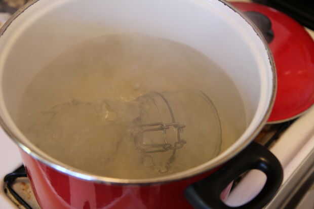 Llene una olla grande con agua y calor hasta que el agua está hirviendo. Meter su jarra en el agua hirviendo lentamente. Hervir tus tarros de almacenaje en el agua hirviendo por un mínimo de 10 minutos.