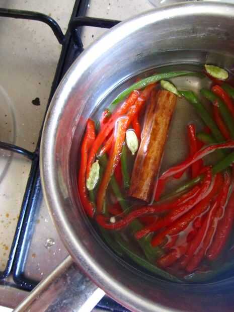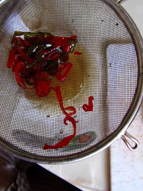 Escalfar los chiles durante 20 minutos, luego escurrirlas y quitar cualquier semillas/ralladura que podría haber agregado.