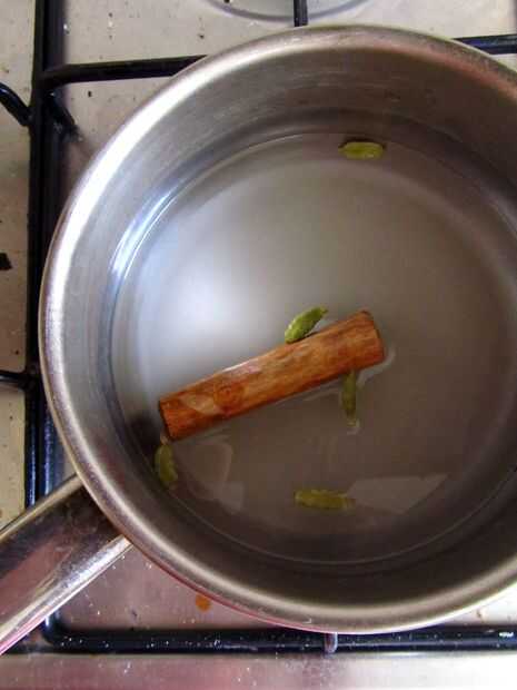 Poner 1/2 taza de azúcar, 1/2 taza de agua y su elegidos especias y aromas en un cazo y llevar a ebullición. (Si están haciendo un montón de chiles, o quieren una buena cantidad de jarabe, simplemente aumentar el azúcar y el agua a la misma velocidad, manteniendo la proporción 1:1)