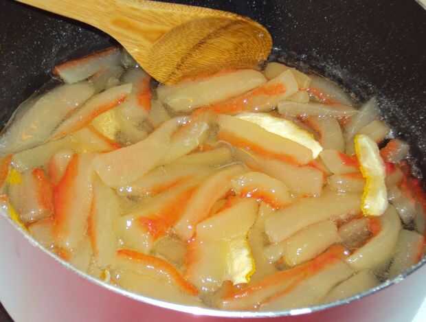 Una vez que el azúcar alcanza la temperatura correcta, añadir la corteza de la sandía.