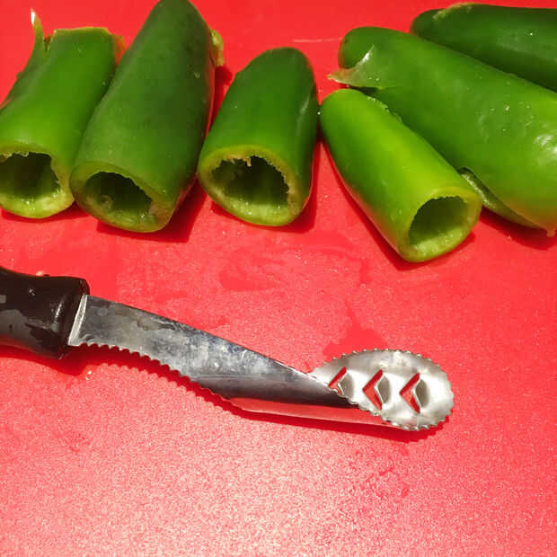 Lavar y secar sus jalapeños y entonces la semilla les. Tengo un jalapeño poco ingenioso siembra herramienta que pretende para limitar la exposición de la piel. Deseche las semillas y las membranas y luego cortar sus jalapeños. Que desee tratar de mantener intacto el círculo de jalapeño, esto hace las cosas un poco más fácil cuando llegan a la parrilla y dependiendo de cómo se utiliza el jalapeños, se ven mejores. Si no quieren tratar con los círculos pequeños, cortar los jalapeños en tiras.