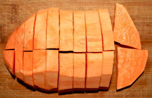 Corte su ñame o camote en trozos más pequeños, tamaño bocado.