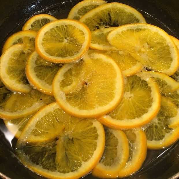 En la misma sartén, poner 1 taza de agua y 1 taza de azúcar a hervir. Revuelva con frecuencia hasta que el azúcar se disuelva. Una vez que el azúcar se disuelva, agrega naranjas y calor inferior. Cocinar a fuego lento hasta que la corteza se vuelve translúcido---desde 30 a 60 minutos. Además la corteza cada vez traslúcido, el agua de azúcar también se convertirá en un jarabe espeso.