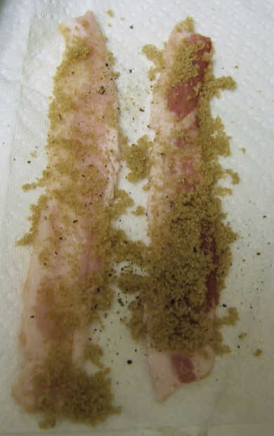 Trabajando en un pedazo de toalla de papel y un corazón a la vez, tocino de temporada con pimienta, luego espolvorea una ligera capa de azúcar moreno.