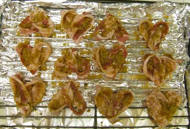 Mueva el tocino a la parrilla preparada. Coloque los bordes cortos de fondo de dos tiras de tocino en la parrilla, superpuestas para formar el punto inferior del corazón. (Nota: he hecho algunos corazones sin azúcar, por lo que la superposición se puede ver mejor.)