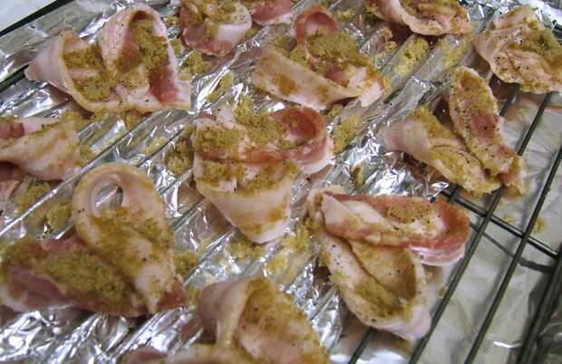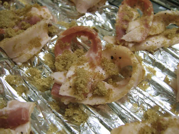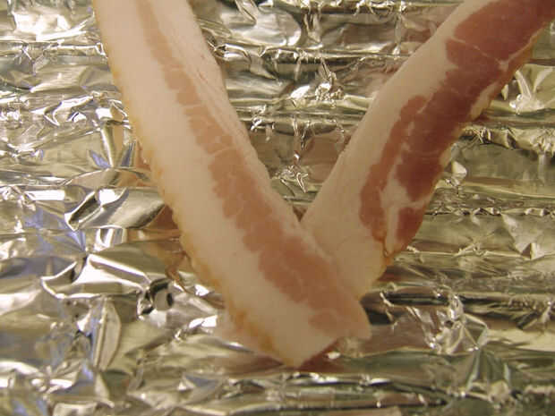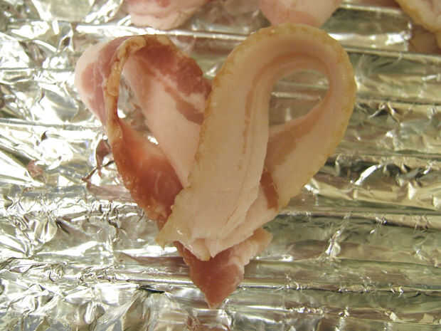 Coloque en el horno y hornear de 25 a 40 minutos, dependiendo del grosor del tocino. Retire cuando crujiente.