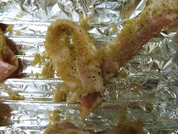 (Si como simples tiras, poner las tiras en la parrilla, pimienta y espolvorear con una capa de azúcar moreno.)