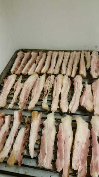 que acaba de hacer tocino!!! corte grueso y colocar en estantes o bandeja. Prefiero acabar en fumador caliente pero también funciona un horno de 400 grados