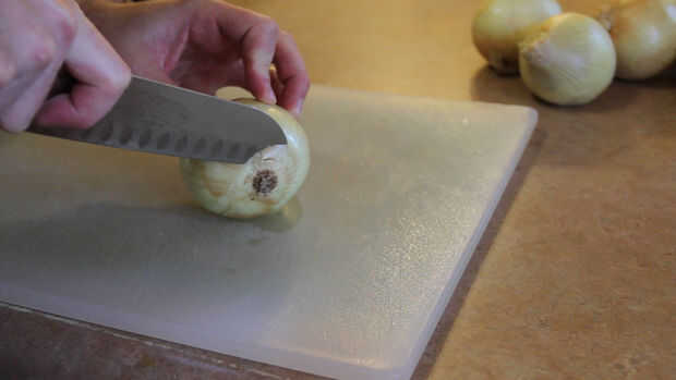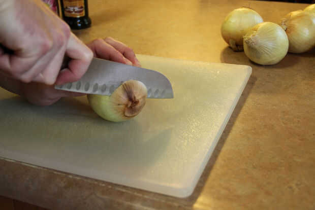 3. Cortar la cebolla por la mitad a través de la raíz.