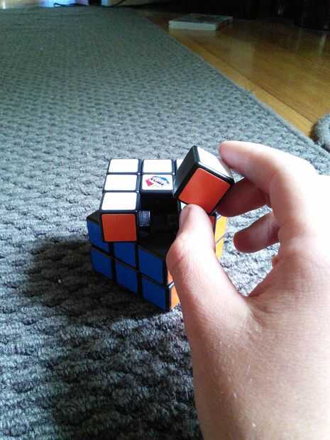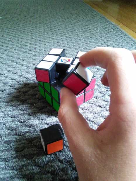 Gire la parte superior del cubo como se muestra arriba y saque las piezas medianas (sólo 2 enfrente de la otra) y hacer lo mismo en la parte inferior.