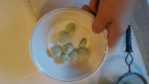 Luego agregué una capa de azúcar de la uva. Empecé por poner una pequeña capa de azúcar en un tazón de fuente entonces poner un puñado de uvas en el azúcar y había enrollado alrededor. A continuación os pongo las uvas en un recipiente de plástico.