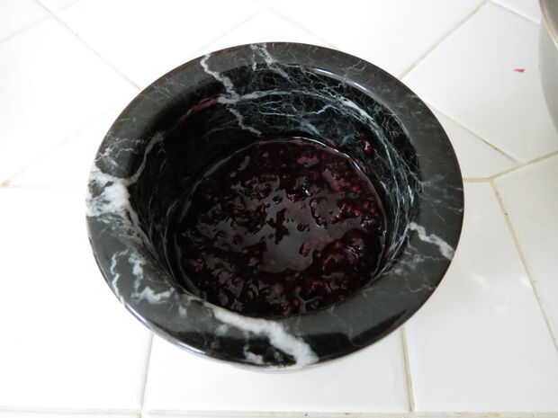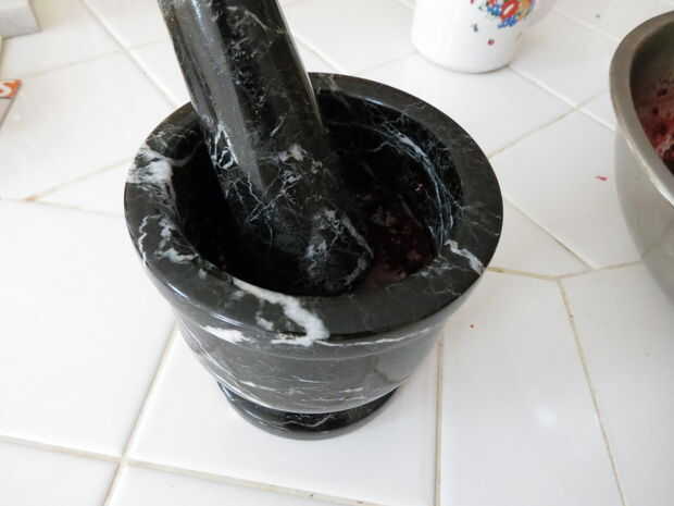 Aplastar las moras, un poco un rato, con un mortero y una maja. Cuando se ve como mermelada, estamos listos.