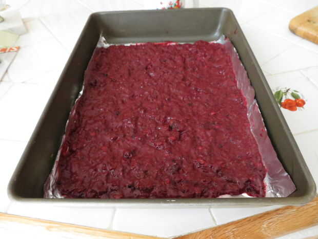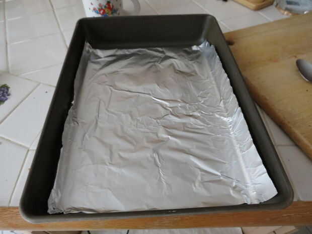 Poner papel de aluminio sobre una bandeja de 12 por 8 y Esparza la mezcla sobre la hoja. Congelarlo durante la noche.
