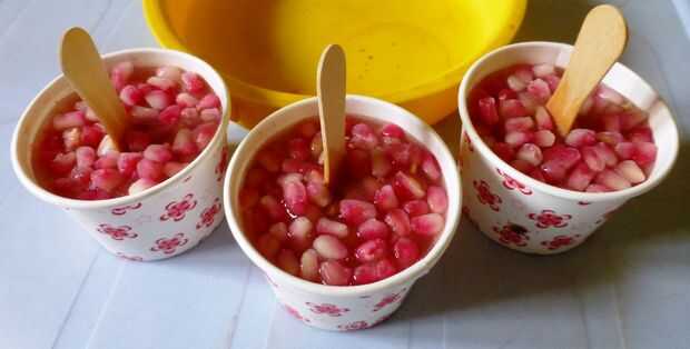 Aquí es una receta muy sencilla de suerte con semillas de Granada, jugo de limón, agua de rosas y miel, todos los extractos de cosecha fresca de la huerta casera.