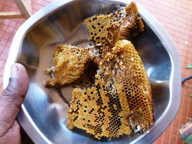 Aquí he cosechado un pequeño trozo de panal y extraer la miel. Puede requerir unas dos o tres cucharadas de miel. Las abejas viven en nuestro jardín y reconstruirá el pedazo de panal sacado.