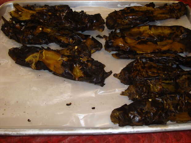 • Coloque cuidadosamente los chiles asados (a la izquierda de pieles quemadas en ellos) en la hoja de galleta que estén rectas.