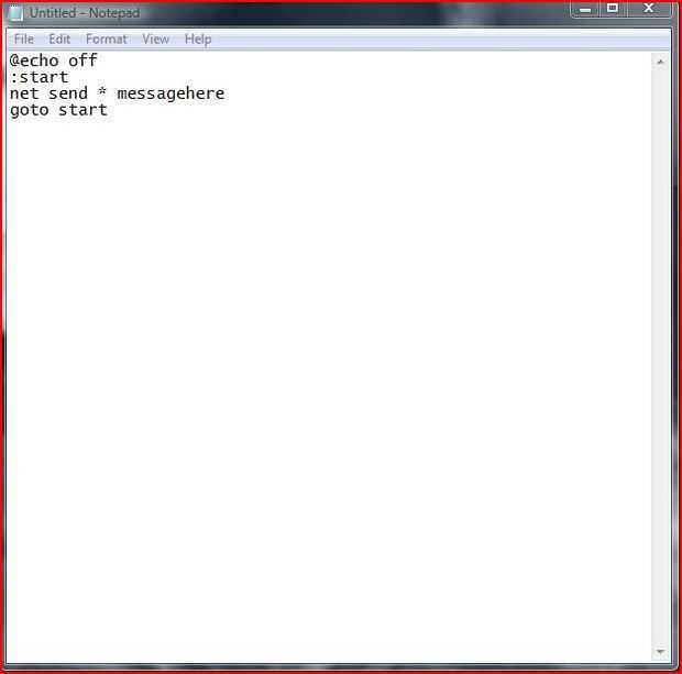 Lo que esto hará es enviar un mensaje emergente a todos los equipos en su red y luego bucle hacia atrás y hacerlo de nuevo. Que voy tan rápido como sea posible, tomar todos el uso de CPU. Así, nadie podía detener el programa (como el que toma CPU) sin apagar la máquina. Como todos los equipos de la red va balísticos con pop-ups, nadie sabrá que se está causando (especialmente si ejecutas esto desde dos ordenadores en la red, ya que sería tanto causas pero como víctimas).
