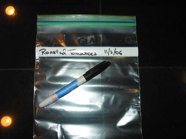 Adquirir una caja de bolsas de congelación de quart para trabajo pesado. Usted quiere ser capaz de descongelar los tomates en tomas de un solo uso, por lo que no va para bolsas más grandes, a menos que estés en la cocina en serio a gran escala.