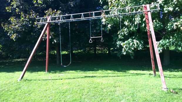 Una sección rescatada de una torre de antena de TV, posible este columpio. El diseño de la torre de metal hace un haz fuerte de peso ligero, conveniente para los 3 cabritos. También, he utilizado la estructura para carga de materiales pesados en una camioneta. Este proyecto tuvo 2 fines de semana para construir.