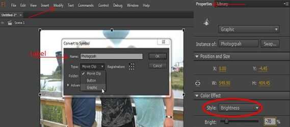 3. la imagen está correctamente colocada, seleccione la imagen, y luego elija modificar convertir en símbolo. En el cuadro de diálogo que aparece, guardar este símbolo como un