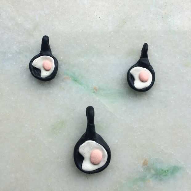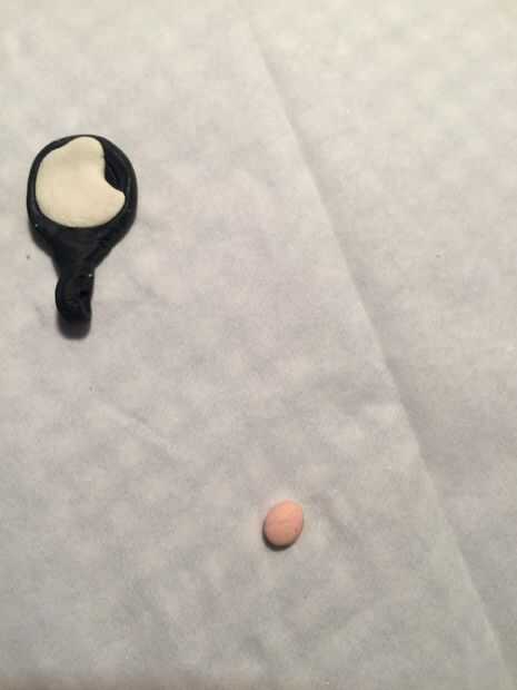 2. con una pequeña pizca de arcilla hacer una esfera ovalish. 3. Presione esta en la clara del huevo y aplanar ligeramente. 4. realizar el otro pendiente del mismo modo. Hacer el colgante de la misma manera, pero un poco más grandes.