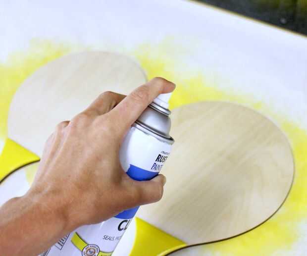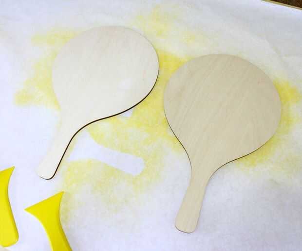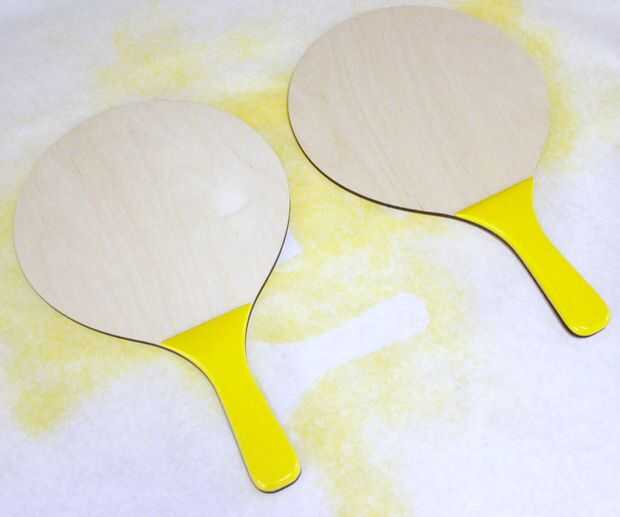 Colocar las palas sobre un papel seco, dos de las mitades de mango en lugar * establecer y rociar una capa delgada de la capa transparente en la zona de la paleta principal (no es necesario para cubrir las manijas).