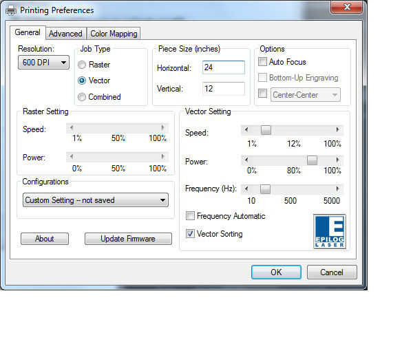 Nota: Los valores siempre están aquí para un Epilog 120 vatios leyenda EXT láser cortador. Ajuste si tiene una máquina diferente. Si usted necesita un repaso sobre cómo láser de corte, haga clic aquí.