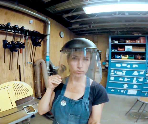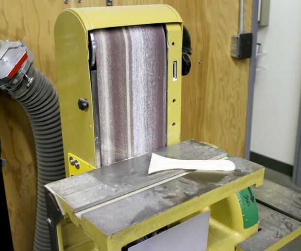 Después de poner en protección ocular (gafas de seguridad o una careta, porque soy serio sobre seguridad - como usted puede ver en mi foto), utilice una lijadora de husillo vertical y lijadora de banda vertical para suavizar los bordes de las mitades de mango. (como en la foto)