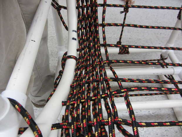 Se basan en el reposabrazos y el tubo que voy a dejar los tubos de la estructura trasera. Los reposabrazos son 20.5 pulgadas de largo y tienen un pedazo de codo en la parte delantera y una T en la parte posterior. La salida de la T en la parte trasera se compone de 2x4.5 pulgadas piezas. La pieza superior 4.5 pulgadas tiene una toma de T que tiene una pieza de 22 pulgadas chorro en él. Estas piezas 22 soportes PVC estructura trasera doblada.  El finales cuatro cuadros ilustran esto.