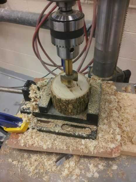 Después de todas sus piezas se cortan necesita perforar los orificios donde van a quedar sus velas. Desde que estoy usando velas de té mis agujeros se perforarán en el centro del titular con 1,5 pulgadas de diámetro y una profundidad de.5 pulgadas con una broca Forstner. Después de que los agujeros se perforan hacia fuera está listo para el paso 4.