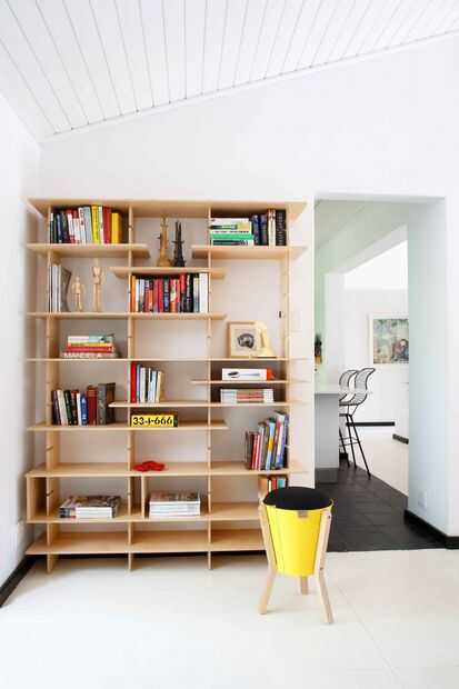 Nos encanta nuestro apartamento, pero sólo tiene un closet. Así que tenemos que ser creativos con la ropa y el almacenamiento del libro. Un estante grande era una buena solución para apilar ropa doblada y otras cosas. Vivir en un loft pudimos hacer un estante alto de 8ft.