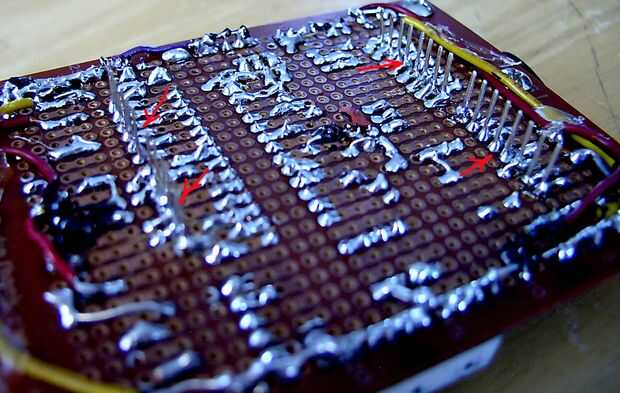 La foto final es otra variación de un Hacduino, uno construido en un antiguo circuito en blanco que tenía puesta alrededor en mi caja de chatarra. Esta tiene un aspecto más crudo que mi otro HAC, ya que tuve que hacer más improvisación y mano-alambre los buses de energía.