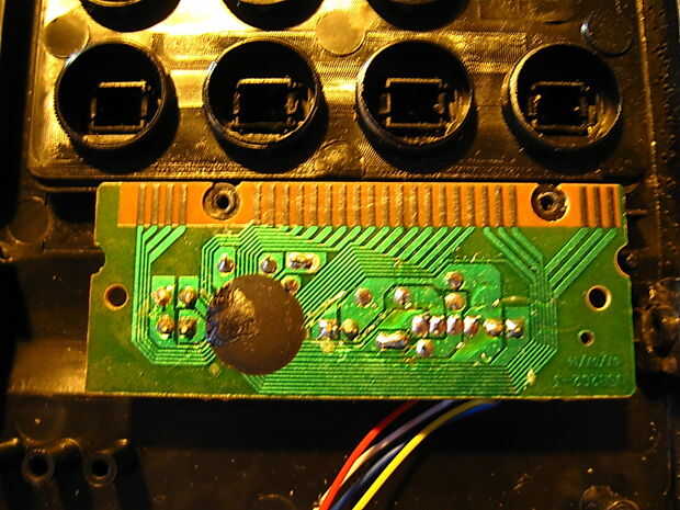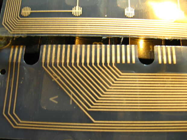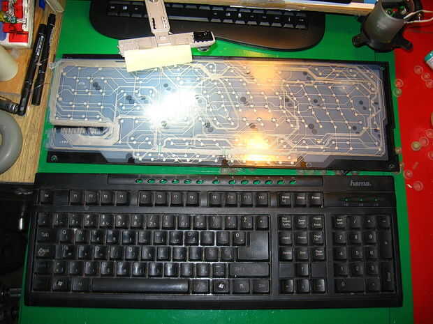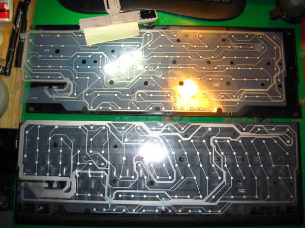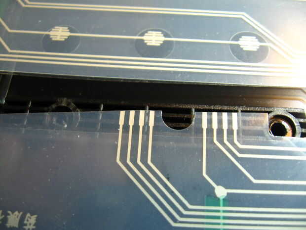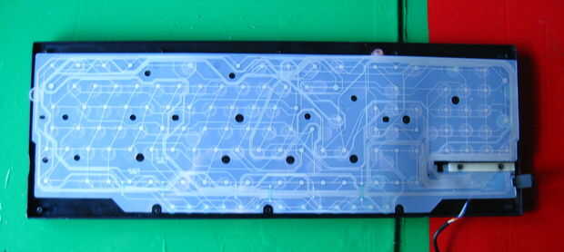 Open the keyboard. En el interior se encuentra un pequeño circuito y dos láminas de plástico que han impreso trazos conductores. Hay una hoja de aislamiento entre ellos con agujeros que las manchas en las dos hojas se reúnen y actúan como un interruptor, cuando se unen los dos puntos de conductoras, para completar el circuito. Cada punto actúa como un interruptor y de la impresión conductora en una sola hoja conduce a un conjunto de pines en el circuito y el otro los trazos que van a otro conjunto de pines en la placa de circuito.